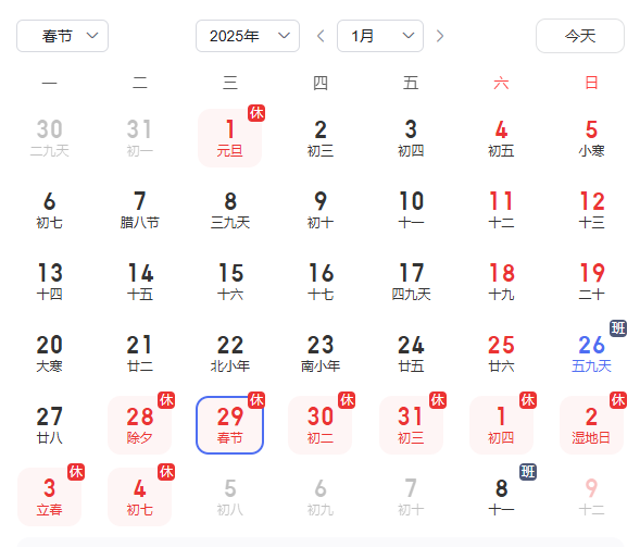 放假时间:2025年1月27日(周一)——2025年2月4日(周二),共九天。