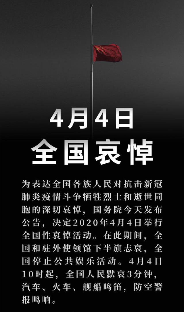 为表达全国各族人民对抗击新冠肺炎疫情斗争牺牲烈士和逝世同胞的深切哀悼,国务院今天发布公告,决定2020年4月4日举行全国性哀悼活动。在此期间,全国和驻外使领馆下半旗志哀,全国停止公共娱乐活动。4月4日10时起,全国人民默哀3分钟,汽车、火车、舰船鸣笛,防空警报鸣响。