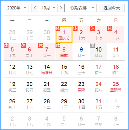 放假时间:2020年10月01日(周四)——2020年10月08日(周四),共八天。