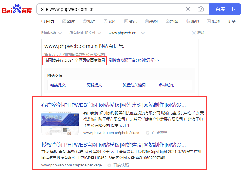 网站首页收录,即这个网站首页主域名被收录了。举例网站建设(http://www.phpweb.com.cn)查看方式,直接把域名放百度里即可: